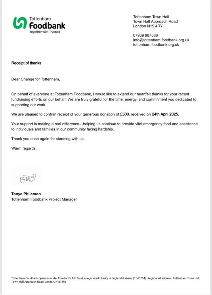 Thanks to your support, CFT have made donations to the Tottenham Food Bank and Noah’s Ark Children’s Hospice from the profits of our protest flag sales.